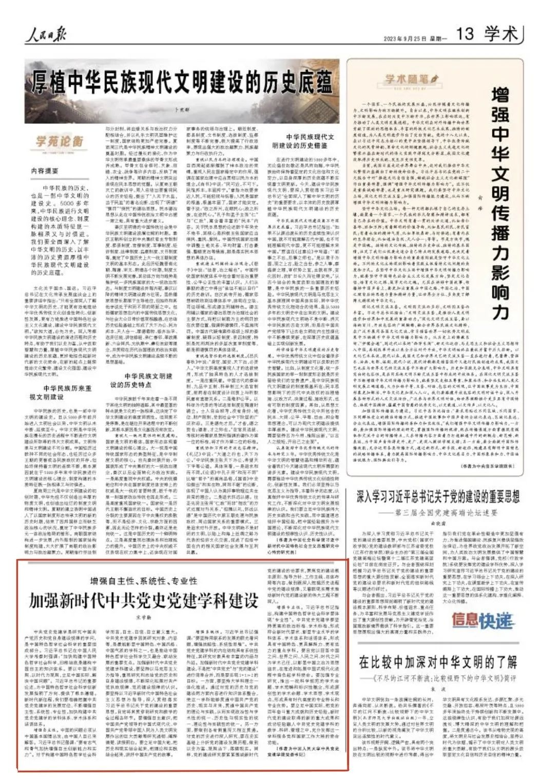 中共党史党建学是研究中国共产党历史和党自身建设规律的学问,是中国特色哲学社会科学的重要组成部分。习近平总书记在巴卡漫画 考察时强调:“加快构建中国特色哲学社会科学,归根结底是建构中国自主的知识体系。要以中国为观照、以时代为观照,立足中国实际,解决中国问题”。习近平总书记的重要论述,为中国特色哲学社会科学创新发展指明了方向、提供了根本遵循。新时代新征程,我们要准确把握中共党史党建学的发展定位,不断增强自主性、系统性、专业性,加快构建中共党史党建学的学科体系、学术体系和话语体系。