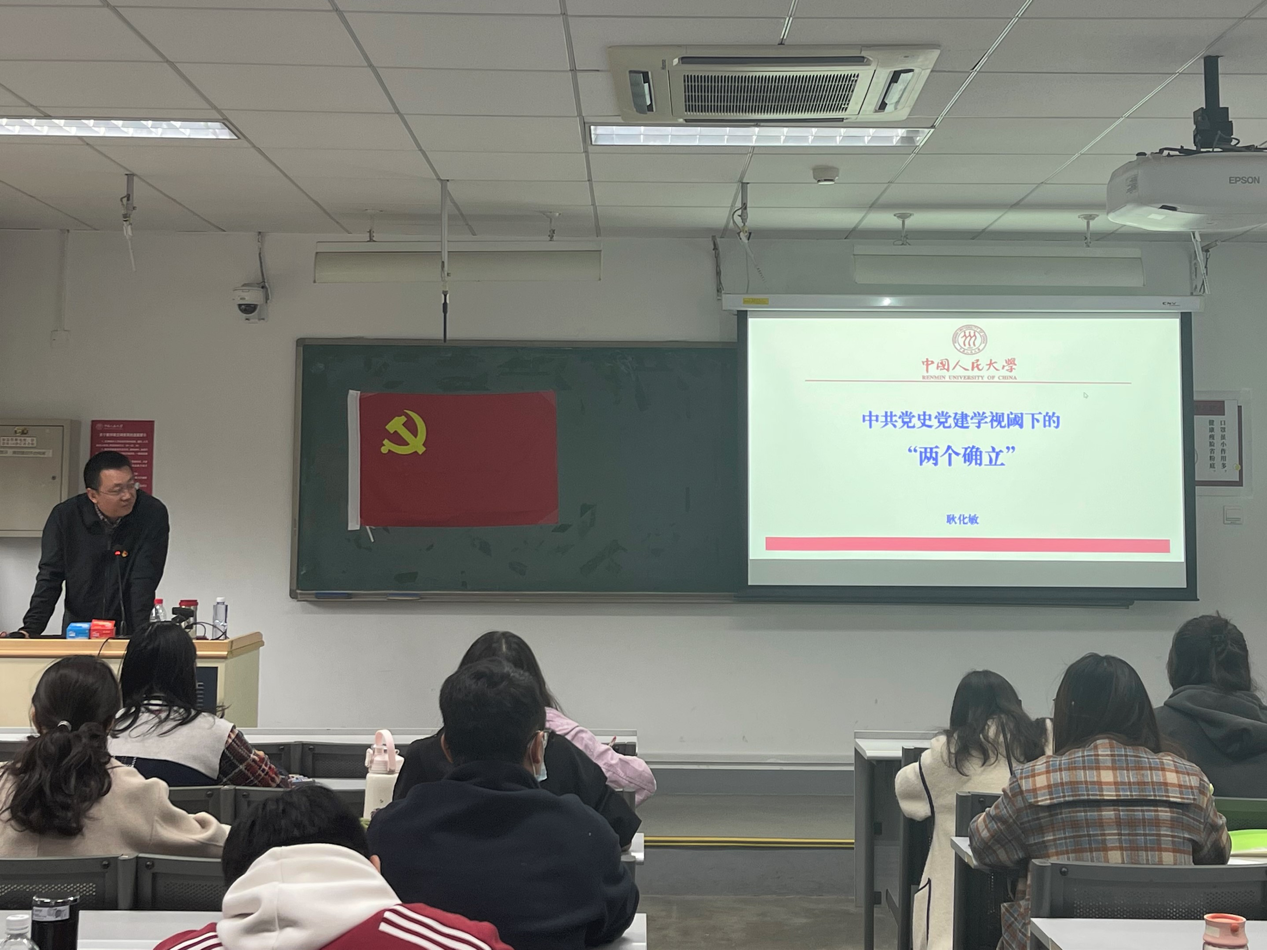 随后,耿化敏带领同学们深入理解内涵、精准把握外延,解读了“两个确立”的指称要义。他指出,第一个“确立”从党的政治建设维度确立党的领袖在党中央和全党的“核心”地位,第二个“确立”在党的理论创新维度确立了习近平新时代中国特色社会主义思想的指导地位。其中,第一个“确立”是第二个“确立”的前提和基础,第二个“确立”是第一个“确立”的延伸和升华,两者同源同向,具有党践行初心使命的同一性。